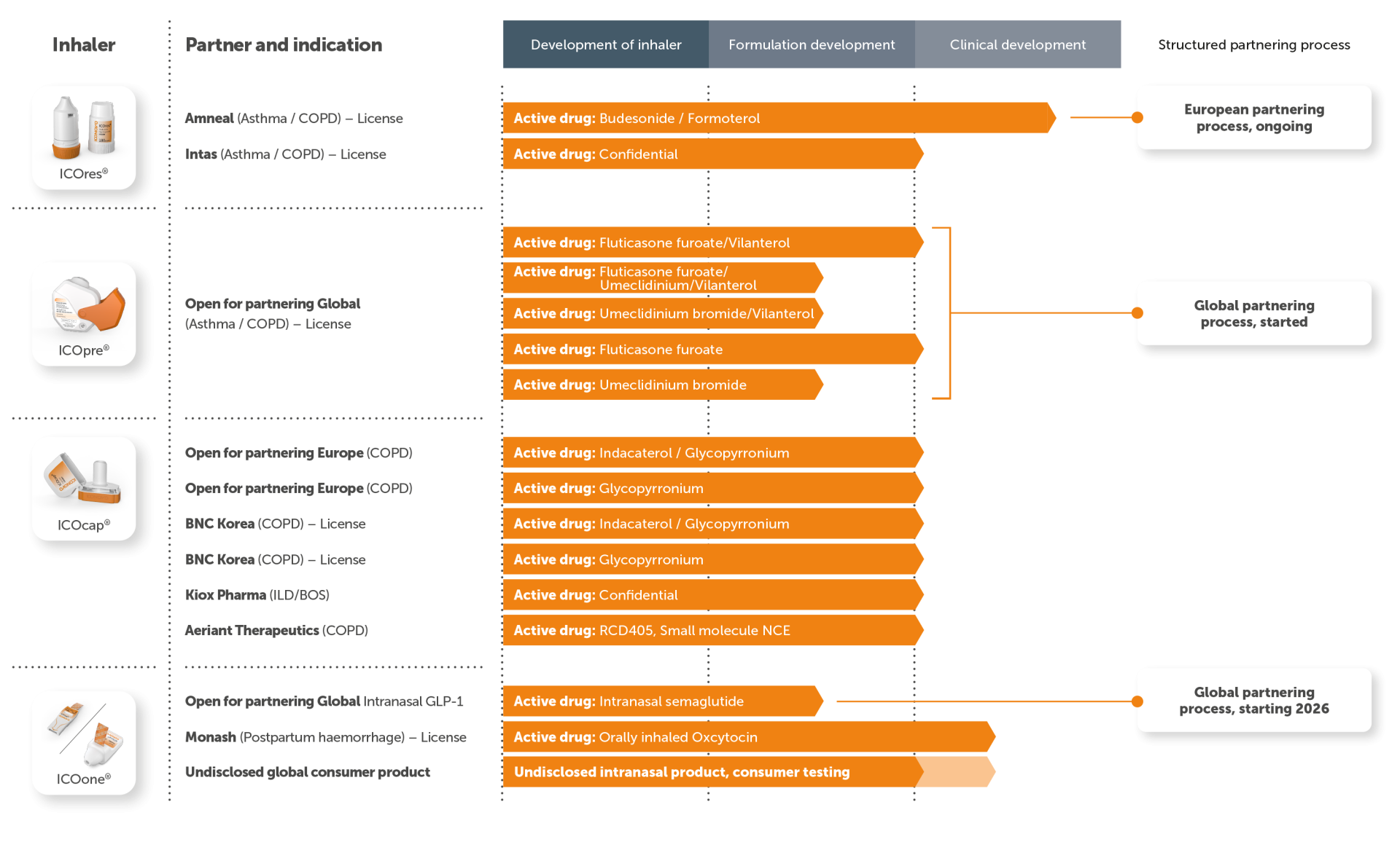 Iconovo has developed ICOpre®, a dry powder inhaler that is substitutable for GSK’s Ellipta inhaler, along with a combination formulation of the anti-inflammatory drug fluticasone furoate and the bronchodilator vilanterol. After showing comparable in-vitro characteristics, the product is ready for a first pilot pharmacokinetic study. The plan is to develop the entire portfolio of Ellipta products. The product is currently undergoing an out-licensing process.